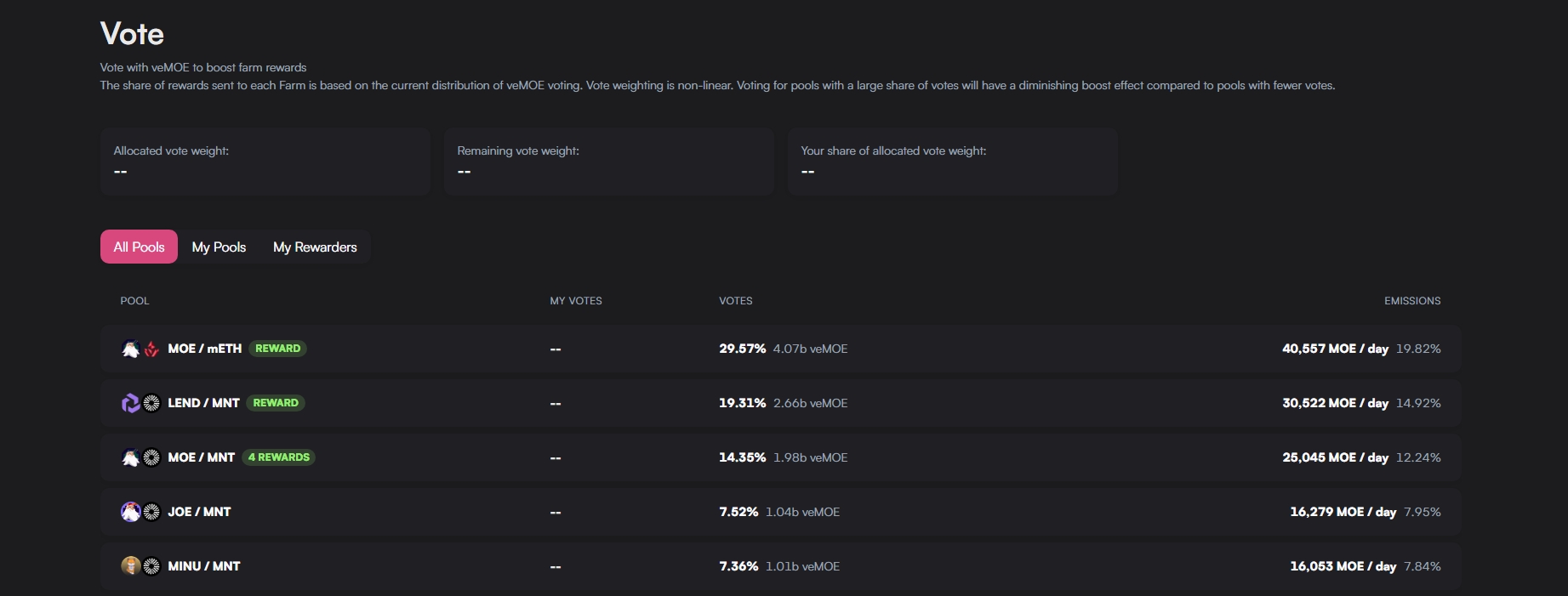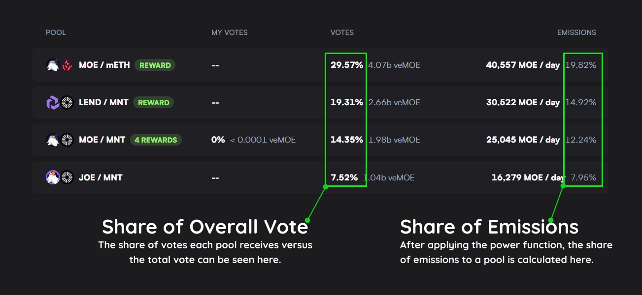 Users will use their veMOE to vote for pools to boost their rewarded MOE token emissions. These rewarded pools will have a MOE farm to function as liquidity mining rewards. Additional rewards for users may be earned by voting via Voting Rewards.