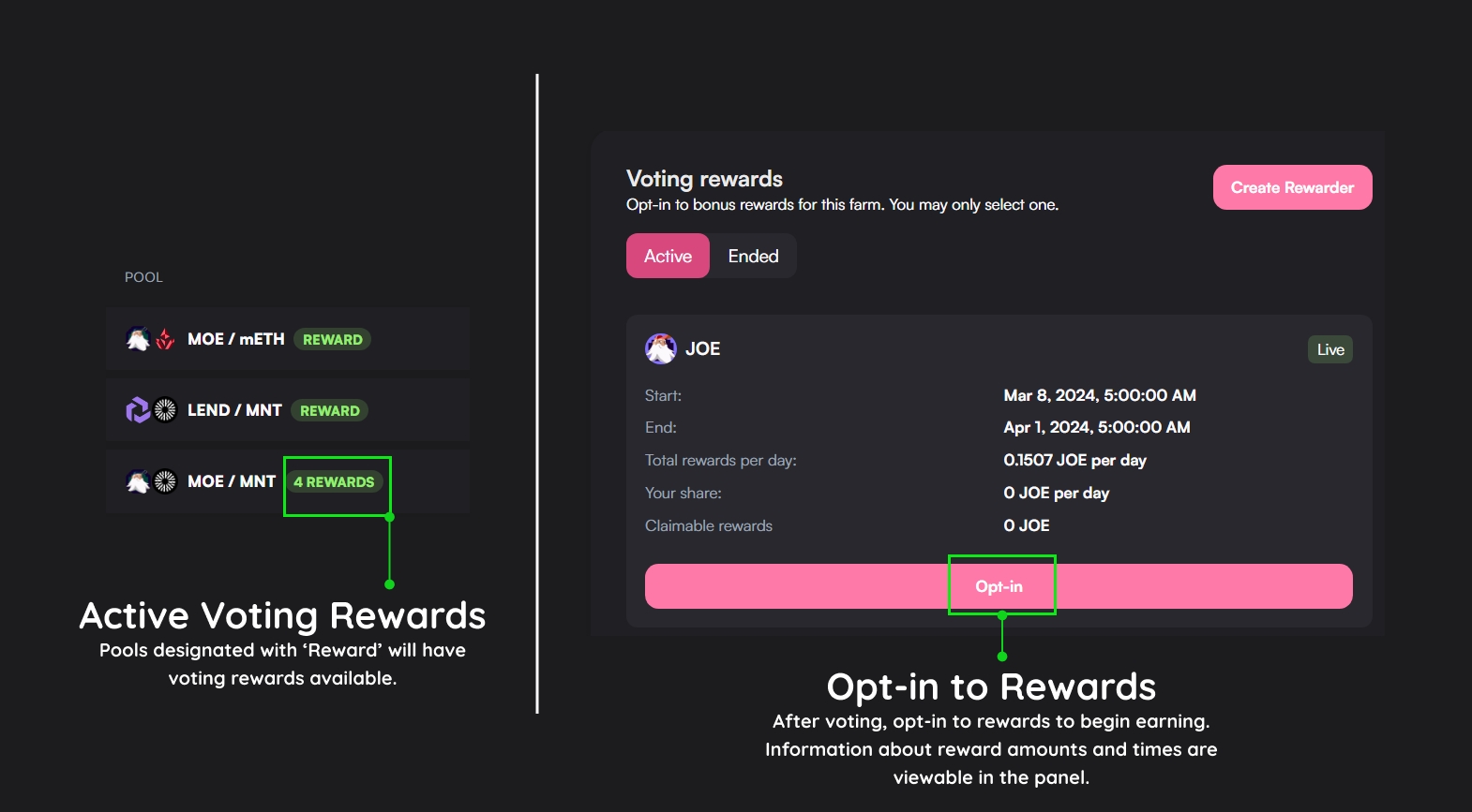 The reward programs are created by the team. If you'd like to introduce a Voting Rewards Pool, please contact the Merchant Moe team. In the future, they may be created permissionlessly.