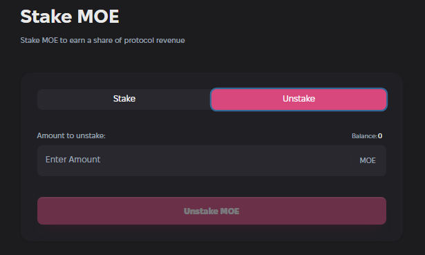 <figure><img src="https://content.gitbook.com/content/7xGkLWks5sCWVlryPjtN/blobs/1GFewDCo6JeOxtFVXizv/image.png" alt=""><figcaption><p>Toggle to Unstake to unstake your MOE</p></figcaption></figure>
