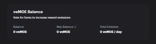 <figure><img src="https://content.gitbook.com/content/7xGkLWks5sCWVlryPjtN/blobs/SAxuOZJqIJ90Cmj3DGAC/image.png" alt=""><figcaption><p>Users can view their veMOE balance on the Staking Page. To vote with veMOE, go to the Vote Page.</p></figcaption></figure>