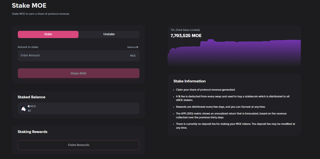 These trading fees are collected every 1-3 days, swapped to $MOE token, and distributed to MOE stakers, proportionally to their staked MOE balance. To claim your rewards, simply click “Claim Rewards” and confirm any wallet transactions.