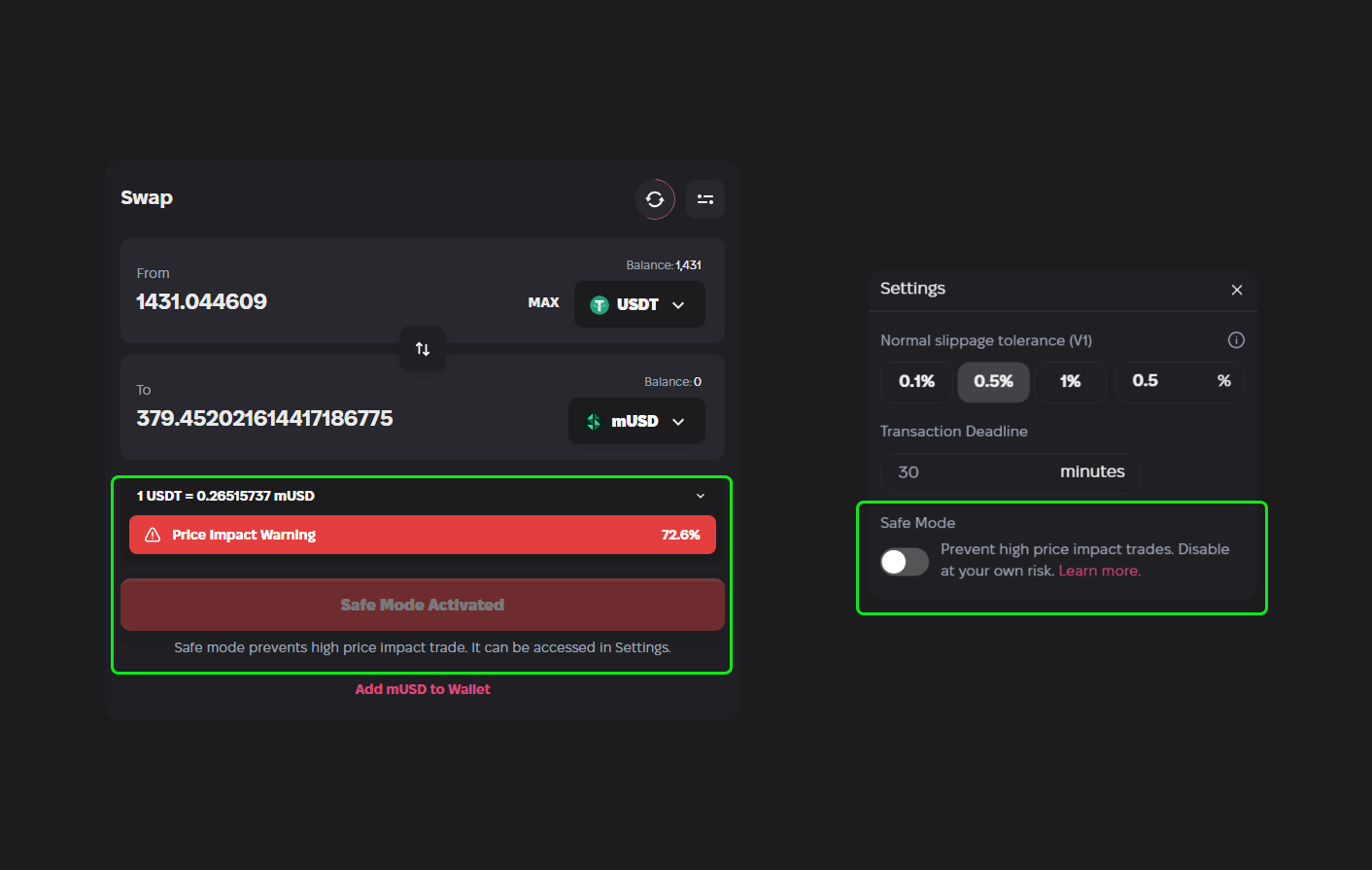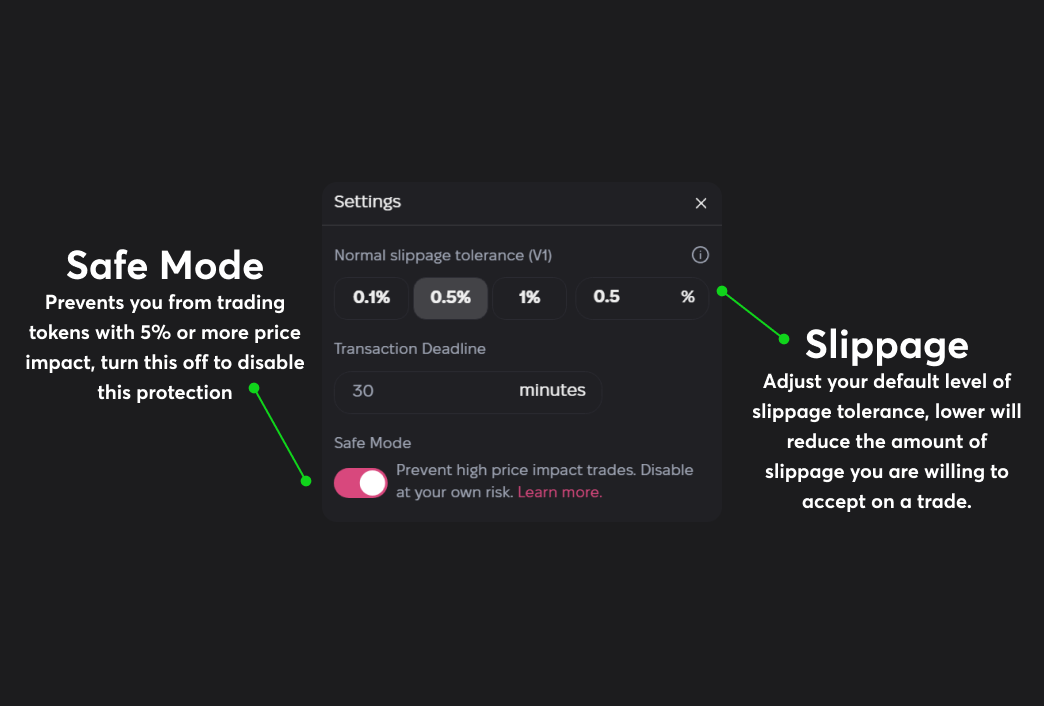 If your trade causes a price impact that is over 5% you will not be able to execute the swap unless you turn off 'Safe Mode'. Turn off Safe Mode by clicking on the Settings button and then toggling off 'Safe Mode'.