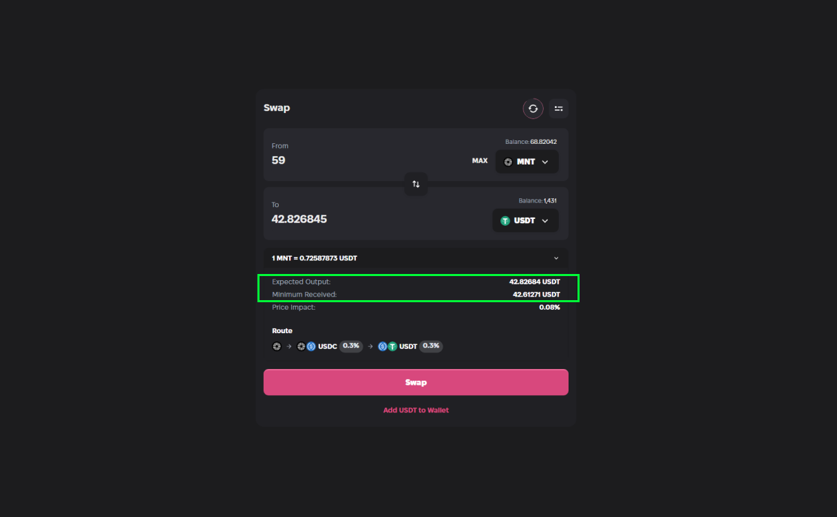 The below example highlights the minimum you can expect to receive based on the Slippage that may occur while the trade executes. This would highlight a slippage of potentially 1.52 USDC tokens.