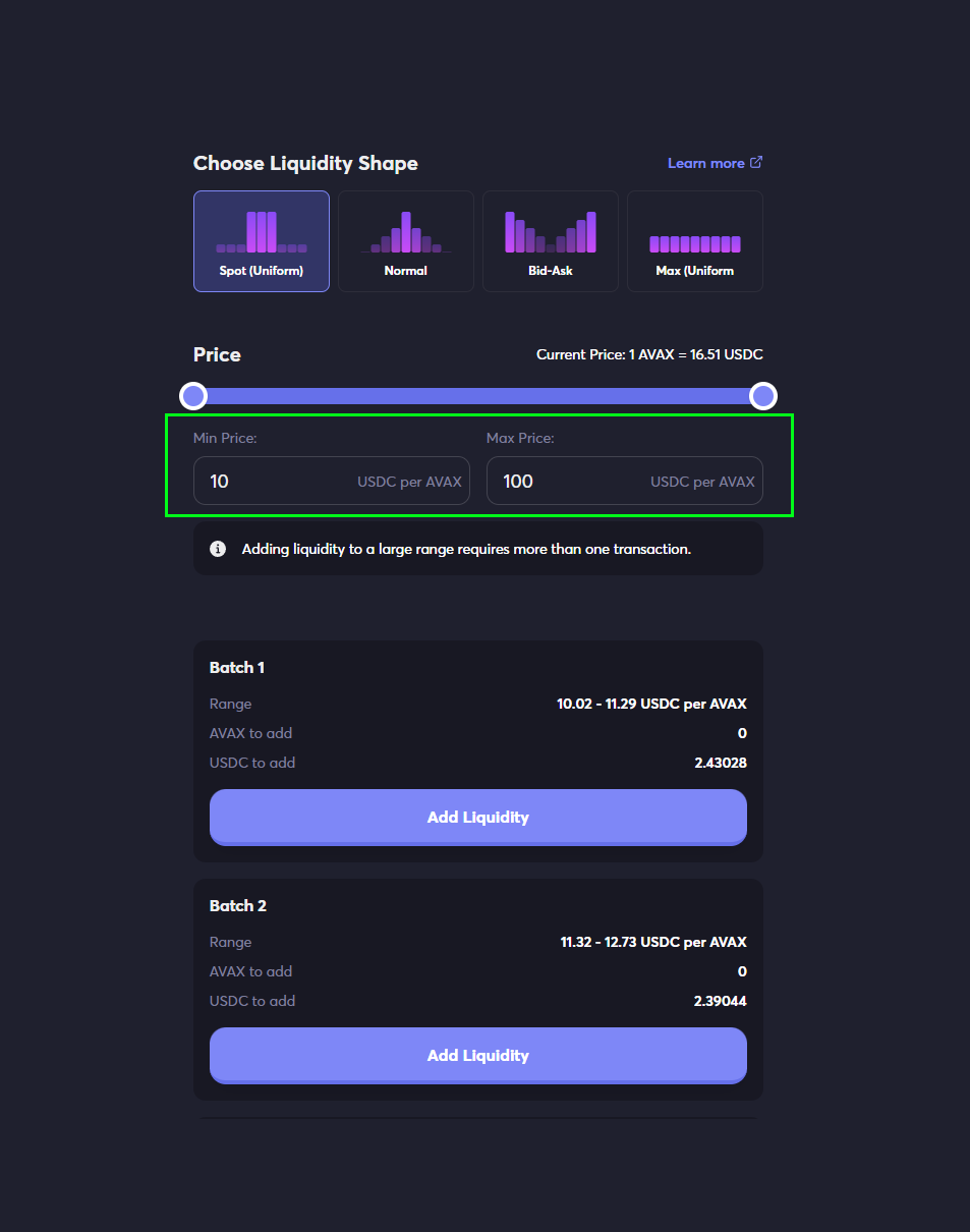 Deploy liquidity over ANY range you desire, select 'Spot (Uniform)' and enter the price range that you want to supply Liquidity to. Next, select 'Add Liquidity' for each batch transaction to deploy your liquidity over the desired range.
