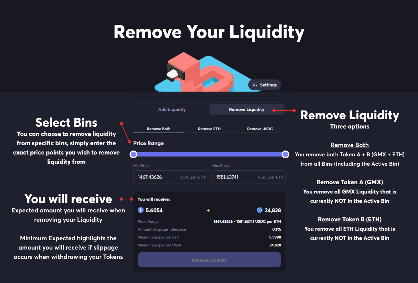 To remove tokens from specific bins, simply enter the price points that you wish to remove tokens from. This feature gives you extra liquidity for managing your position, you may find this useful if you plan to rebalance your existing liquidity position.