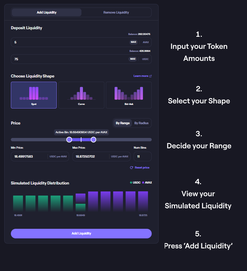Follow the five easy steps below to add Liquidity, or scroll down for a detailed guide.