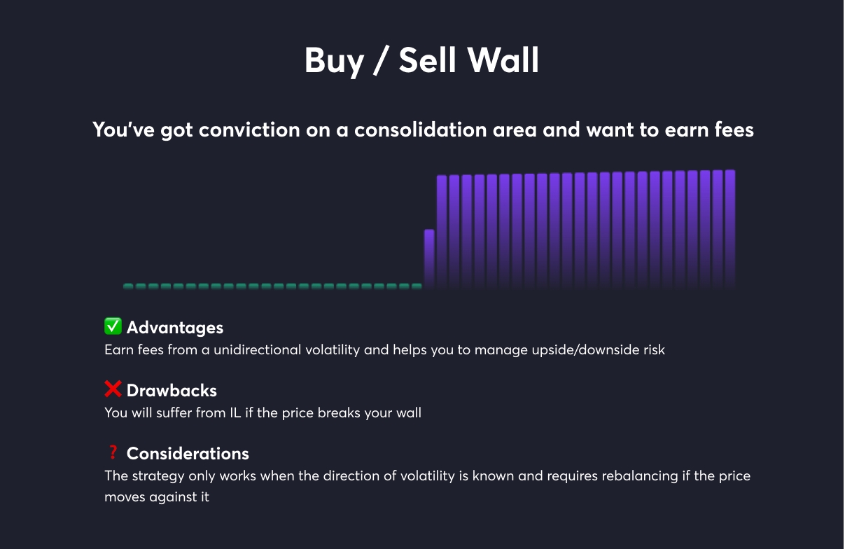 Liquidity Walls can be used by individuals but also by protocols who are looking to ensure the minimum price wall for their native token and perform “automated” buybacks when the price dips.