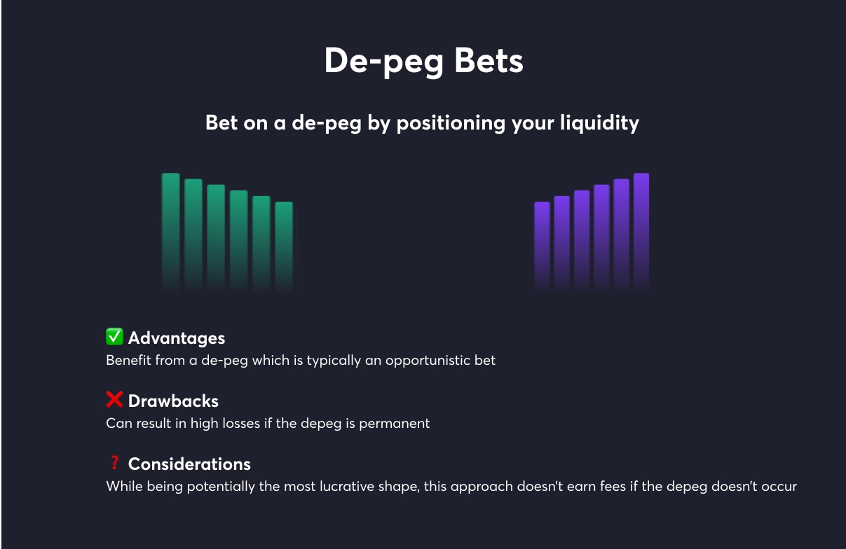 This shape can be deployed as regular liquidity to capture continuous volatility around the specific price point or as a combination of one-time limit orders if any potential depeg is expected to be short-lived.