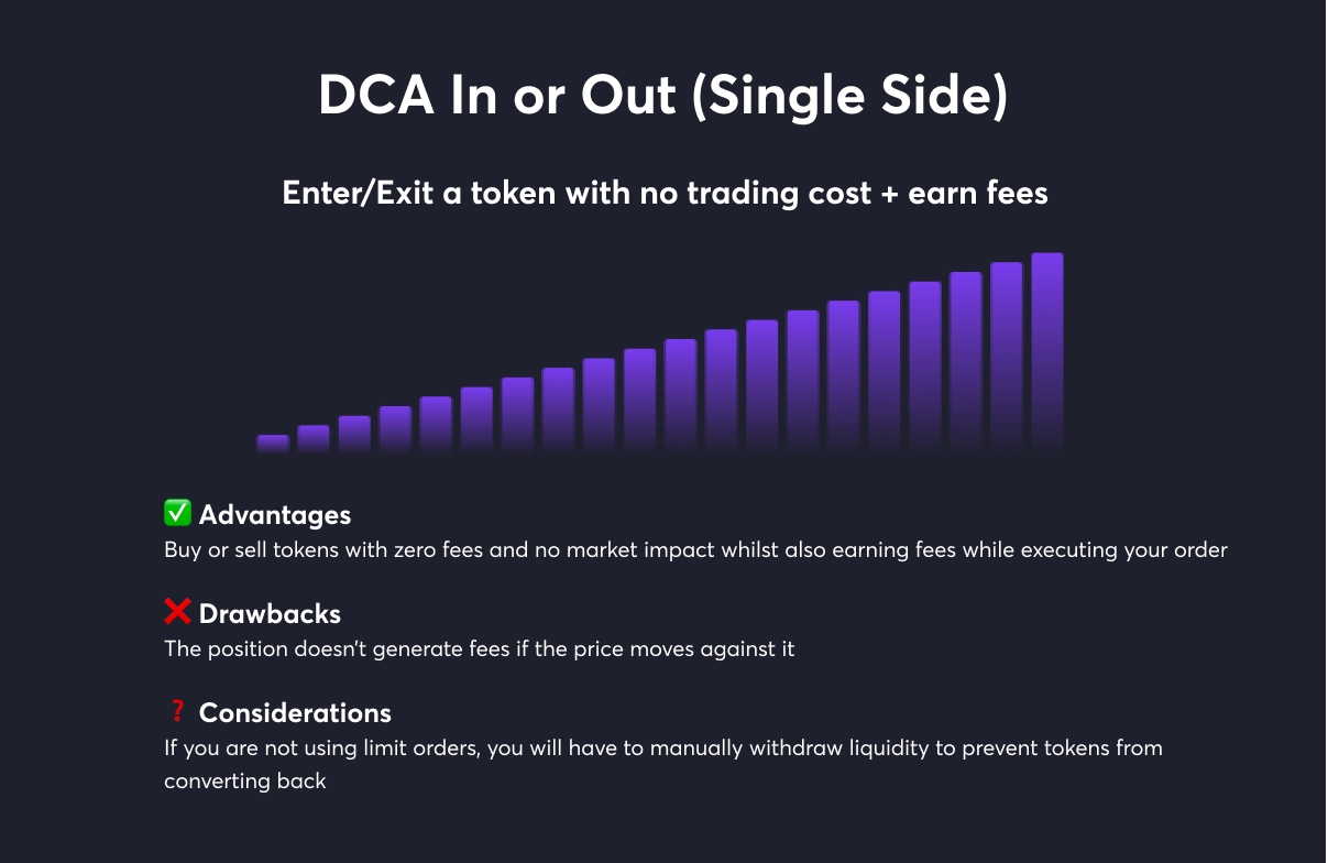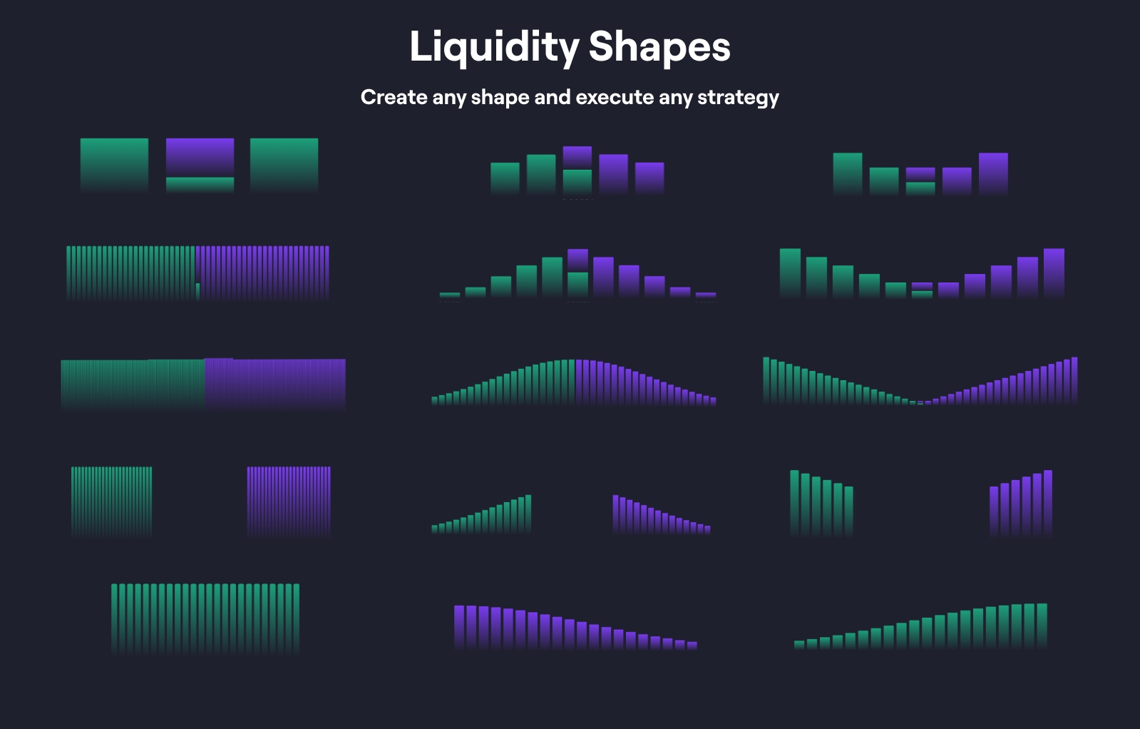 DCA Shapes can be perfect for those who want to acquire large amounts of tokens with zero slippage or simply prefer to exit or enter their positions while being paid. A one-sided Curve or Bid-Ask shape can be deployed alone or in combination with other strategies to achieve the desired Average Cost. If preferable, liquidity can be deployed as a limit order so that tokens are withdrawn from liquidity once the conversion is complete.
