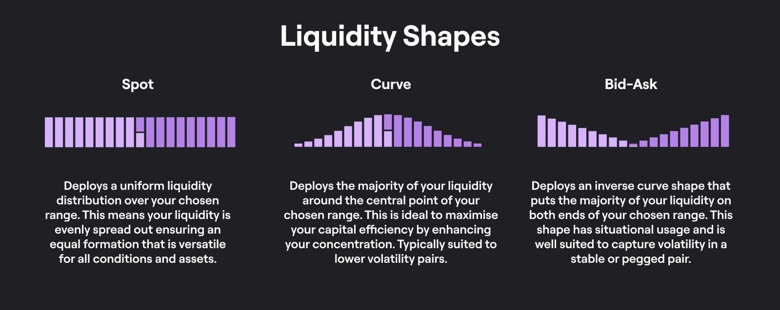 Below is a high level overview of Liquidity Shapes. Each specific bar you see in the liquidity shape is one bin and each bin represents a fixed price point. The below image outlines the three core shapes you can deploy, with an overview detailing the key use-case of each shape.