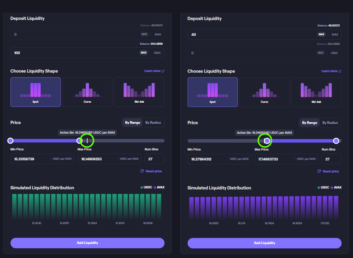 * Use the sliders to set your desired price range. Position both sliders to the left or the right of the 'Active Bin' to focus your liquidity on one side of the market.