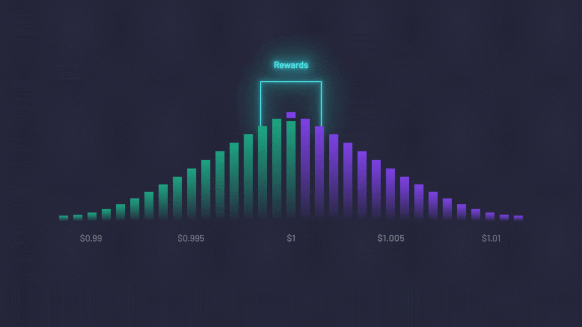 Rewards are distributed proportionally based on liquidity. For example, if one bin has twice as much liquidity as all other bins in the MDMA range, it will receive twice as many rewards.