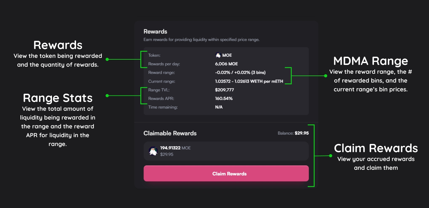 Rewards sent to an LB pool will continuously flow into the incentivization range, and is shared between the liquidity providers based on their share of the overall liquidity in the range. Liquidity provided in LB pools will not require users to stake their LP tokens to farm rewards. $MOE rewards will automatically accrue when liquidity is in range and the rewards be claimable at any time.