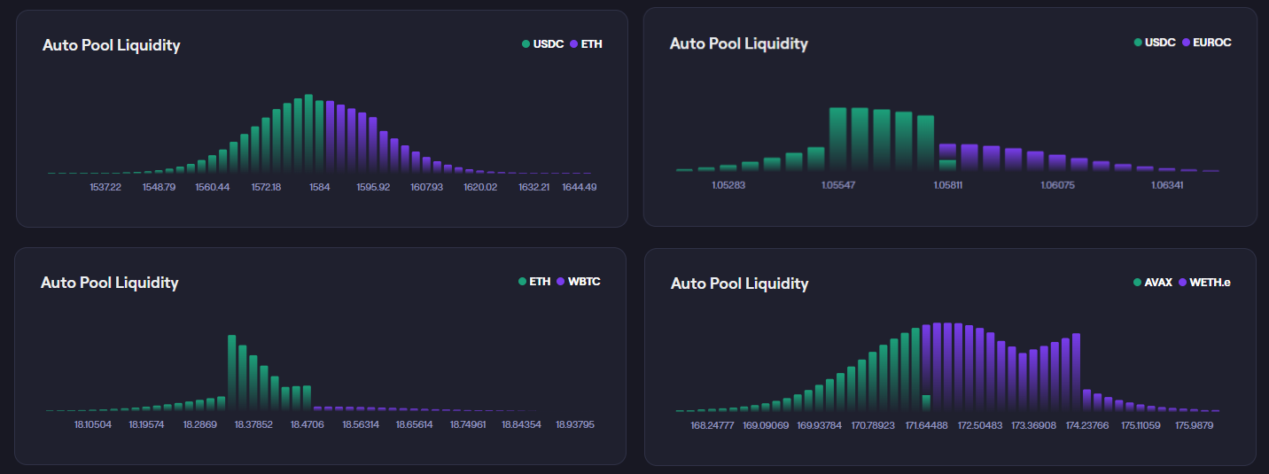 Users deposit Liquidity into an Vault. The Vault will then automatically execute the process of rebalancing the liquidity within a Liquidity Book pool. You can think of the Vault as an algorithmic Liquidity Provider. The algorithm aims to maximise fee generation and it will do that by assessing conditions within the Liquidity Pool and balancing liquidity accordingly to ensure fees are being earned. You will see a variety of shapes and distributions which are decided and executed exclusively by the algorithm.